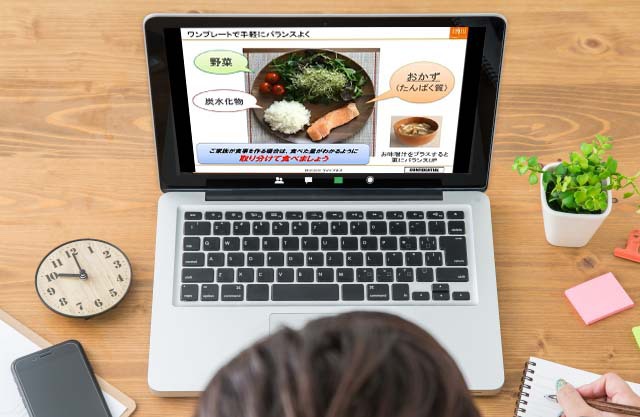 「学習パート」「運動パート」「確認テスト」を基本セットした、1講座あたり5~25分程度の受講しやすいボリュームのeラーニングなのでテレワーク時はもちろんスキマ時間を利用してスマホ受講も可能です。